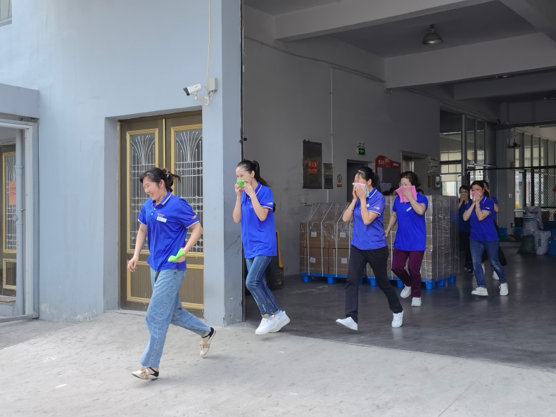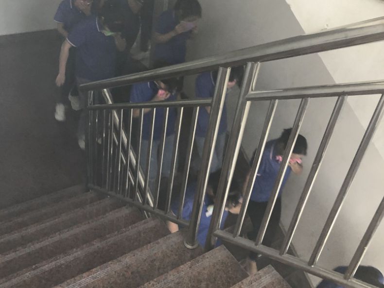 随着单元楼火警警报声响起,车间员工迅速从安全楼梯疏散,低头弯腰同时用手或湿毛巾捂住口鼻迅速往安全通道撤离。